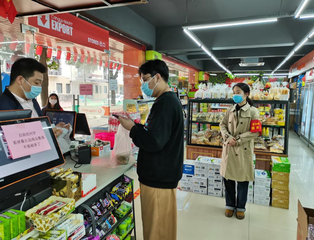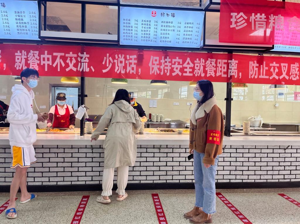 宣传教育突击队在食堂、超市等校内人流量大的区域迅速集结,主动开展党员志愿服务,积极投入到秩序维护、防疫督导等各项工作中,以实际行动守护校园安全。