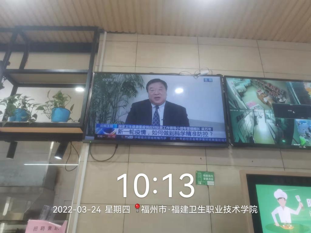 与此同时,督导各食堂大厅电视屏滚动播放防疫宣传视频,使广大师生增强防疫意识,增长防疫知识。