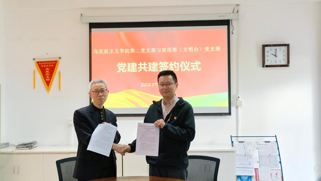 为进一步深化党建引领作用,推动党建与业务工作深度融合。2025年4月3日,宣传部(文明办)党支部与马克思主义学院第二党支部在厚德楼107会议室举办党建共建签约仪式暨“缅怀革命先烈 传承红色基因”主题党日活动,开启了双方党组织合作交流的新篇章。