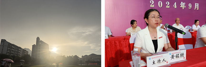 秋雨浸润后的校园,一弯彩虹悄然跨立在校园上空,晨光破晓而出,美好俯拾皆是,给到场的师生们带来无尽的惊喜,仿佛也在这为这一场即将开场的典礼送来祝福。