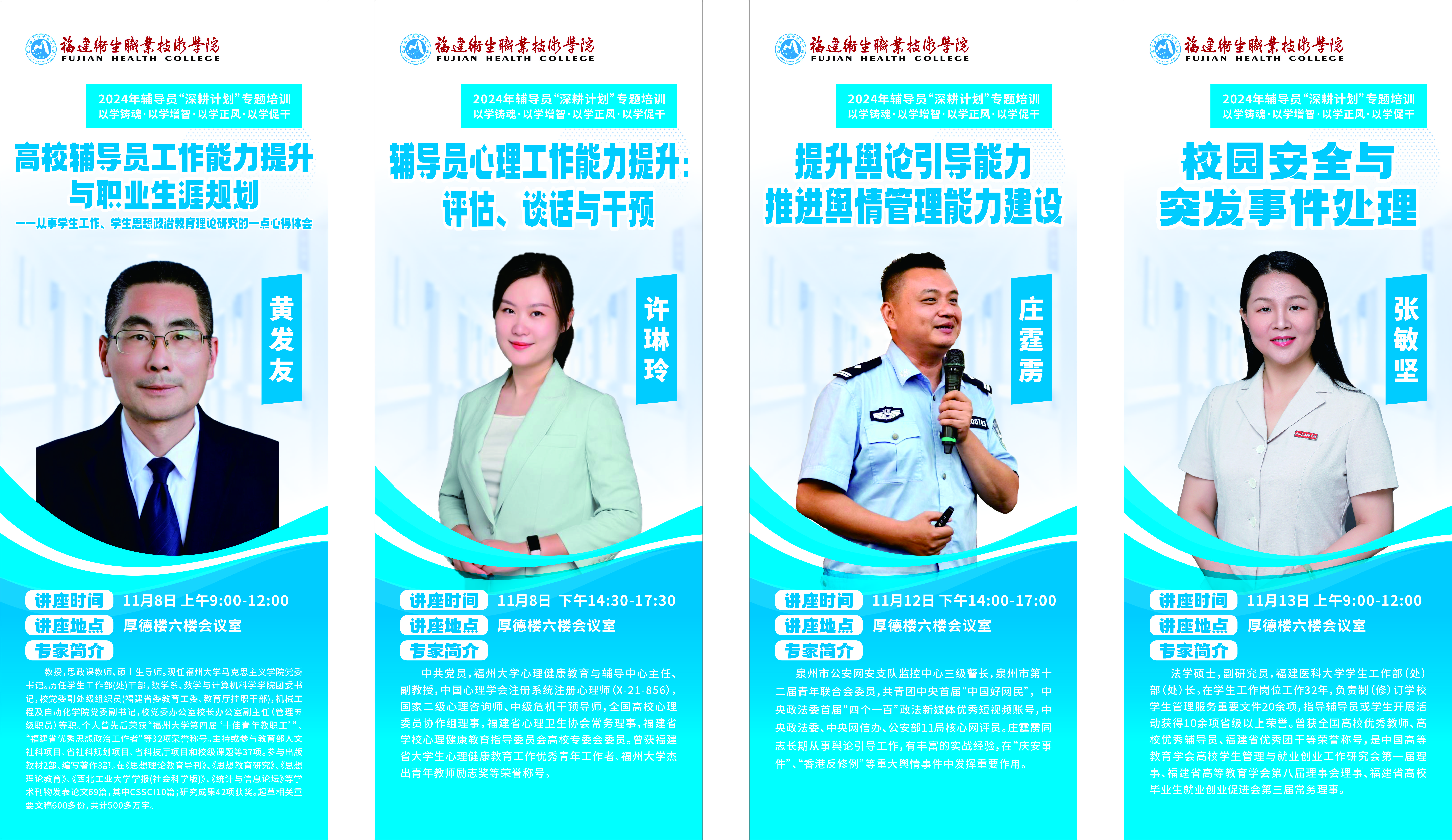 此次培训为期三天,分别邀请来自福州大学、福建医科大学、泉州公安网安支队等单位的专家前来授课,就辅导员职业生涯规划、心理工作能力、舆论引导能力、校园突发事件处理能力等专题内容进行讲授。
