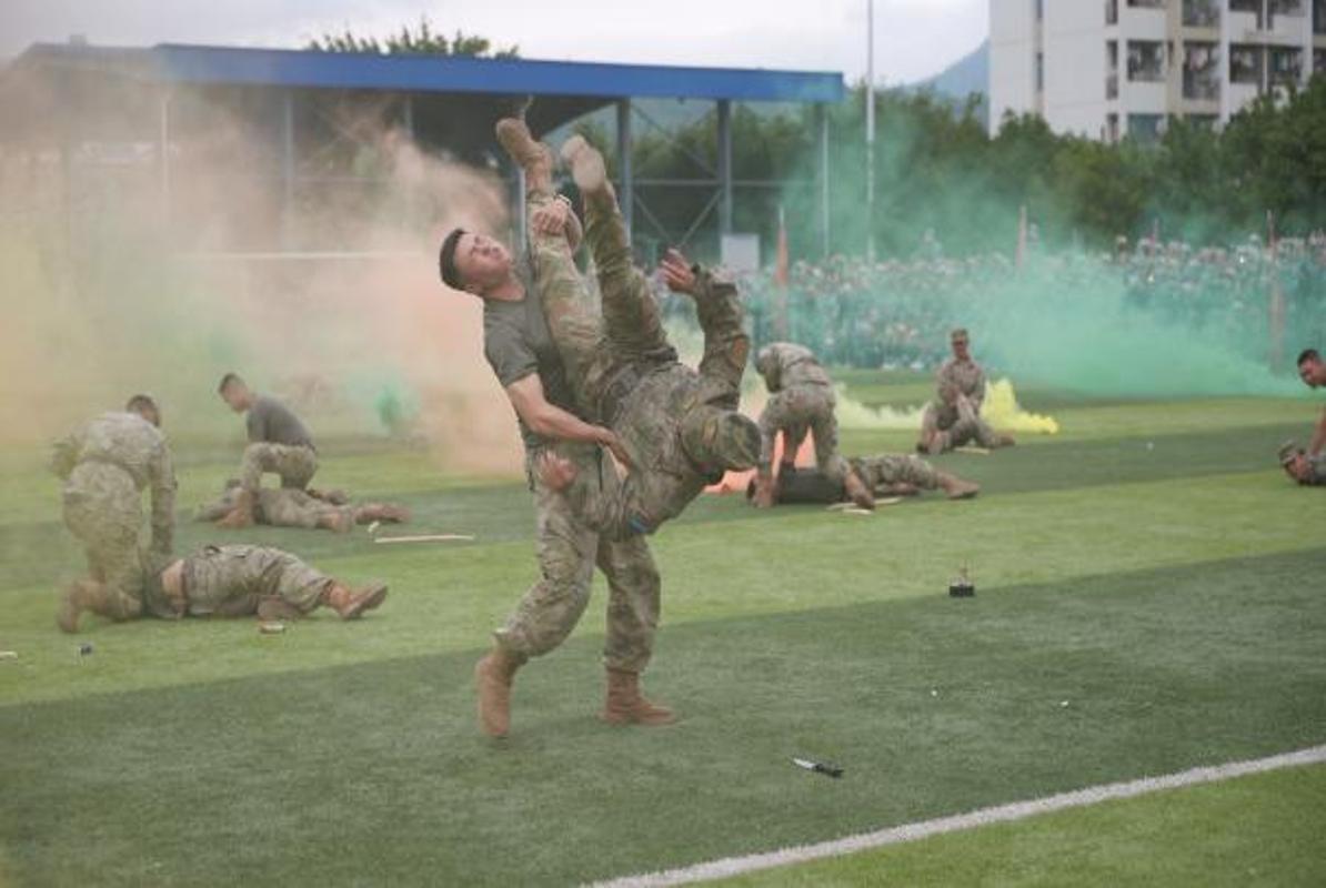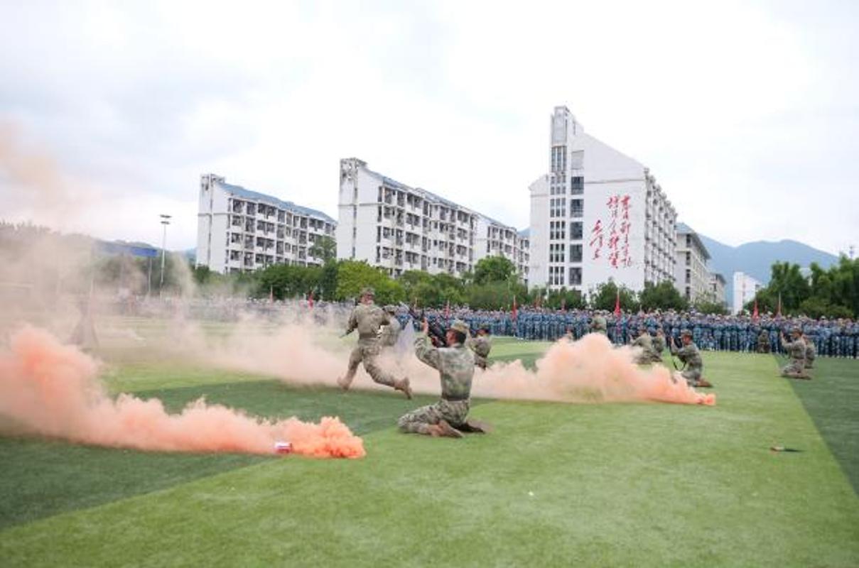 在军事技能展示环节,参训学生带来了“刺杀操”“格斗拳”和“匕首操”等精彩表演。承训教官代表展示了反恐场景,体现了战术配合与高效的应急处置能力,精准的动作、严谨的姿态,让在场学生深受震撼,进一步激发了大家对军人的崇敬之情。