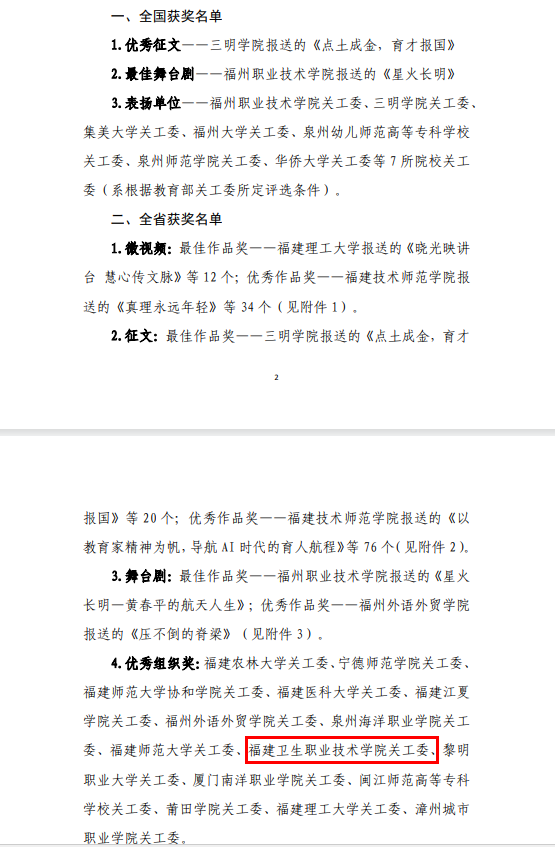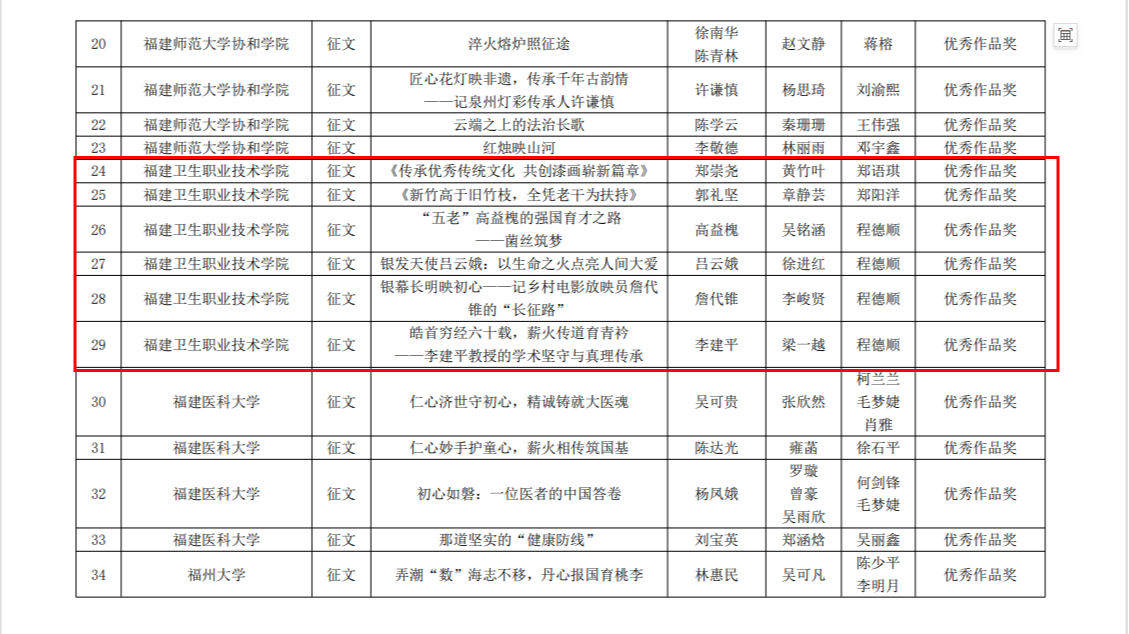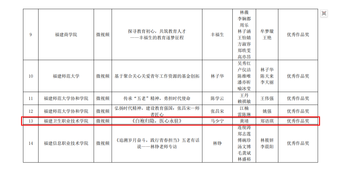 获最佳作品奖的微视频《心系其中·爱在其中》由公共卫生与健康管理学院党委副书记董东、辅导员苖航指导,学生林思棋、钟启良、严登凯撰写并参与拍摄,讲述校关工委成员、退休教师洪常青40年来对教育事业的热爱与坚守。获优秀作品奖的微视频《白袍归隐,医心永驻》和六篇征文全部来自医学技术与工程学院,由教师郑阳洋,辅导员郑语琪、程德顺等三位老师指导,黄靖、黄竹叶、章静芸、吴铭涵、徐进红、李峻贤、梁一越等7名同学对“五老”匠心育人事迹进行访谈及撰写。