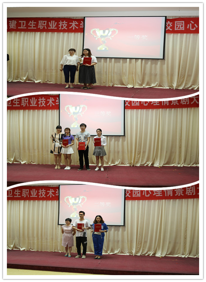 在比赛中,各支参赛队伍分别从入学适应、追逐梦想、同伴关系、自我成长、失恋等不同角度展现了当下大学生的校园生活,通过作品演绎为同学们解决心理问题提供积极经验。经过激烈角逐,17护理318《转身拥抱阳光》获一等奖;17检验302《被排斥的后进生》、17临床304《我的大学》获二等奖;17预防301《明天,你好》、17临定301《跨过去,前面便是天》、17助产304《最初的梦想》获三等奖。