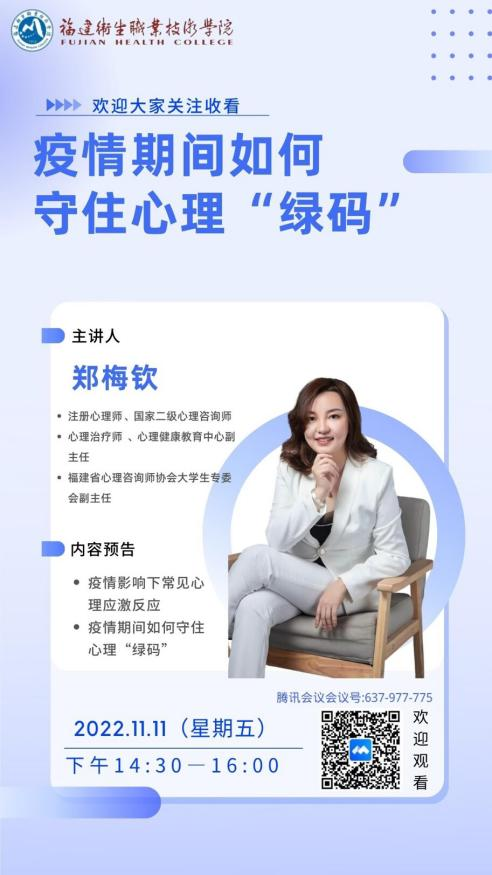 新冠肺炎疫情期间,不仅考验着我们每个人的身体健康,心理也承受着冲击和压力。那么在疫情影响下常见的心理应激反应有哪些呢?该如何进行健康正确的情绪调节呢?为帮助同学们保持心态健康,增强心理免疫力,2022年11月11日(星期五)下午2:30-4:00一场关于“疫情期间如何守住心理绿码”讲座即将开播!由校心理健康教育中心郑梅钦老师面向全校师生开展《疫情期间如何守住心理“绿码”》主题线上讲座,带领大家了解与疏导心理问题,做到抗“疫”的同时也要抗“抑”,共同拥抱心理健康。欢迎各位师生前来观看!(腾讯会议会议号:637 977 775,扫码进直播)