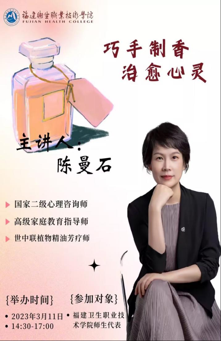 活动预告二:当代大学生时常因为学业压力和生活琐事而感到烦恼,那么,我们该如何正确调节自己的心态呢?3月11日14:30,在心理健康教育中心团辅室,国家二级心理咨询师陈曼石带领我们“巧手制香 治愈心灵”,利用芳香放松情绪,安抚焦虑,纾解心灵困顿,让香味帮我们寻回人间美好。
