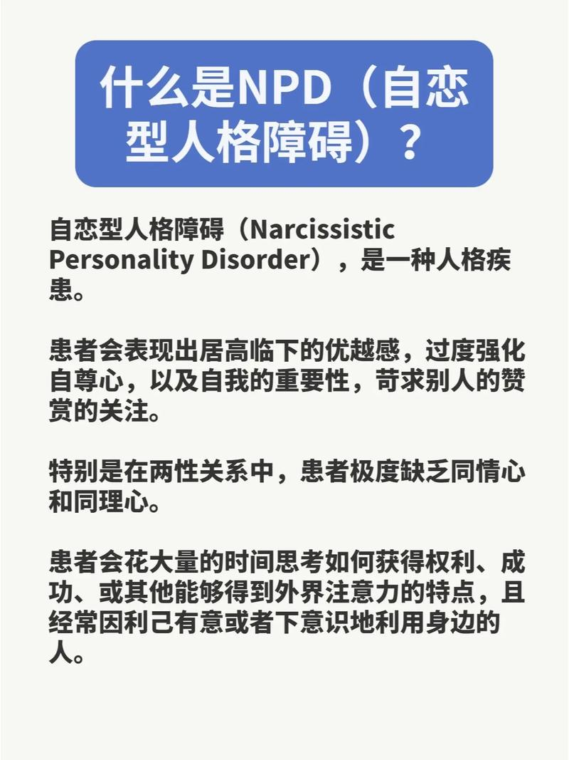 自恋型人格障碍(NPD)是一种心理障碍。有这种障碍的人通常有夸大的自我重要感,比如他们常常幻想自己拥有无限的成功、权力、才华、美貌或理想爱情等。过度关注自己的需求,要求他人过度赞美,且觉得这是自己应得的。他们还缺乏对他人感受的理解和共情,可能会利用他人来达到自己的目的,在人际关系中表现得比较傲慢。