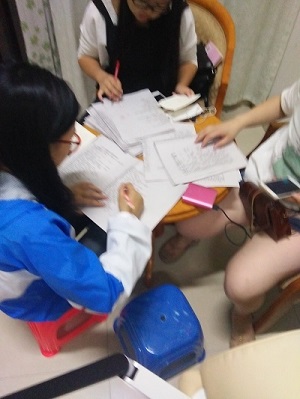社长上台总结这星期的活动内容,说出不足,为下下星期的活动作出准备,随后社长代带领成员前往心理咨询室批改试卷,成员认真紧张的进行批改并为试卷中易错的发表自己的看法。