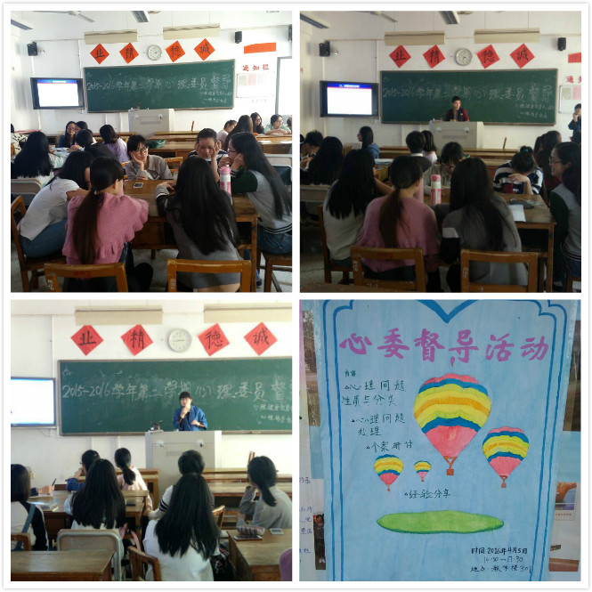 为进一步加强我院大学生心理健康教育工作,使各班心理委员更好地履行工作职责,继上学期新生心理委员系列培训后,心理健康教育中心田伟翠老师于2016年4月5日14:30~17:00,在教学楼301对新生班级心理委员进行了督导,以及时解决心理委员日常工作中遇到的问题。这也是我院第七届“5•25”大学生心理健康月系列活动之一。