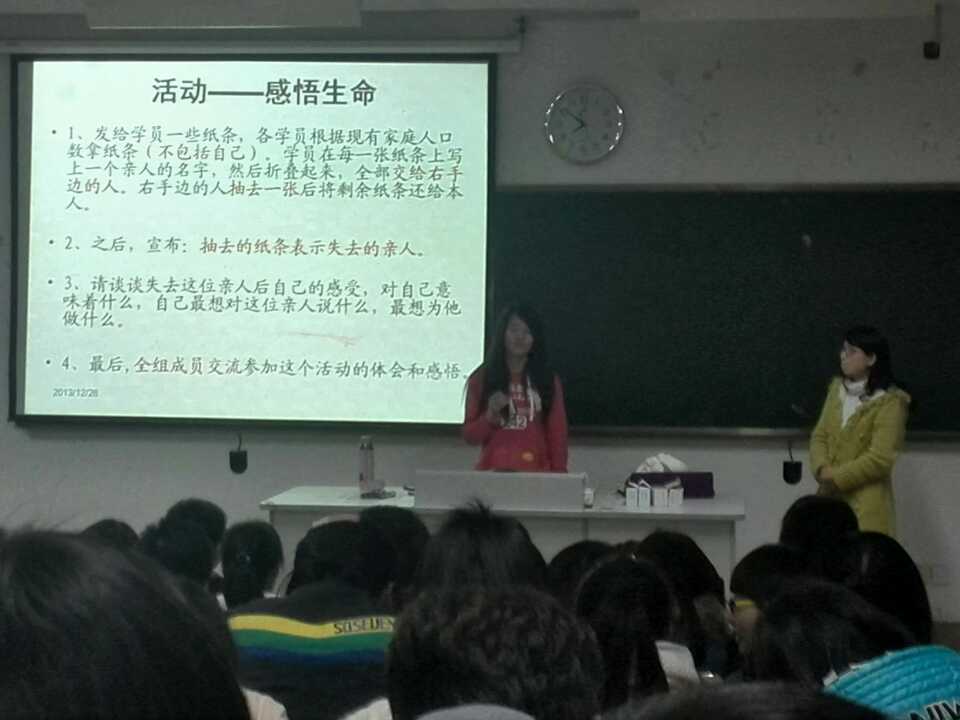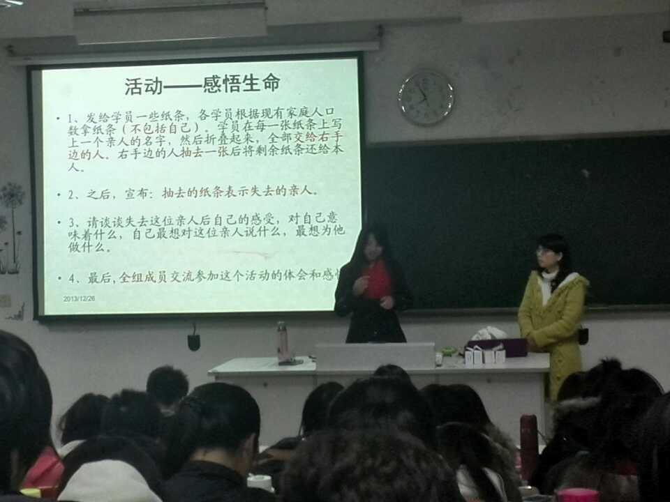 2013年12月26日,由院心理健康教育中心主办、益心心理协会承办的为期六期的心理委员培训第五期在教室115顺利展开。参与的有13级所有心理委员和益心心理协会成员。首先进行课前游戏感悟生命,游戏结束后由同学上台分享游戏后的感悟,游戏结束后,余彩云老师就“大学生心理危机干预”进行讲解,最后,全体起立,立誓言:“针对这次培训的分享内容保密”。