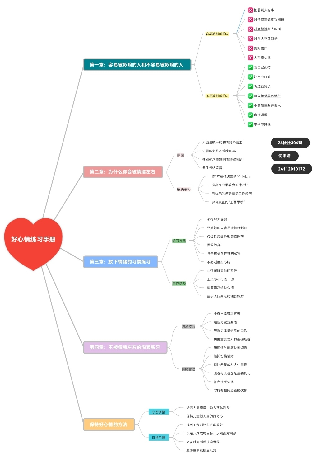 在领读老师的引导下,同学们在读书分享会期间相互交流讨论并结合自身的实际情况分享个人的心得体会,最后还制作了思维导图。通过三期的读书分享会,同学们对情绪产生、变化规律有了更深刻认识,学会了实用的情绪调节技巧,提升了心理调适能力。