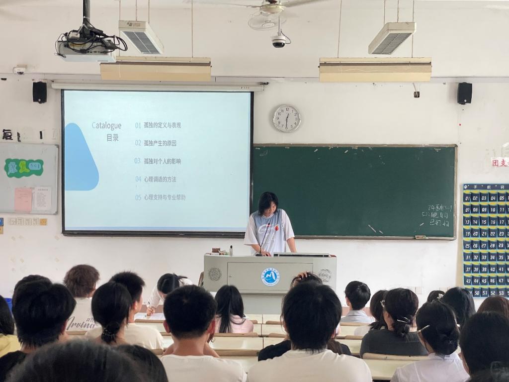 活动现场,演讲者通过精心制作的PPT,用通俗易懂的语言,从多个方面向大家介绍了孤独产生的原因、对个人的影响及心理调适的方法等内容。同时,他以自身如何成功与孤独共处为例,强调积极审视自我内心需求的重要性,并分享了一些实用有效的小妙招,帮助同学们成为自我对话的倾听者。