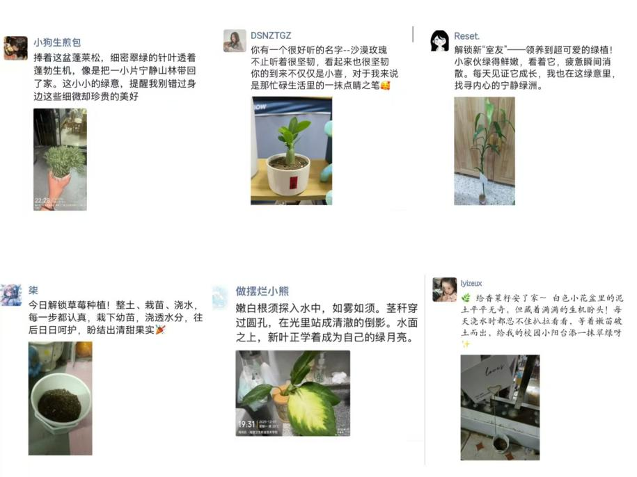 活动采用"线上打卡+线下养护"的模式。同学们通过亲手照料绿植,并坚持每周以图文形式记录其生长过程,在持续观察中获得情绪舒缓。不仅如此,同学们在悉心照料与期待绿植成长的过程中,还能潜移默化地获得内心的滋养与成长。