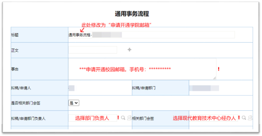 2、填写事由和个人手机号(申请部门邮箱不需要填写手机号)。手机号用于绑定个人邮箱、接收验证码,请一定要填写。示例如下: