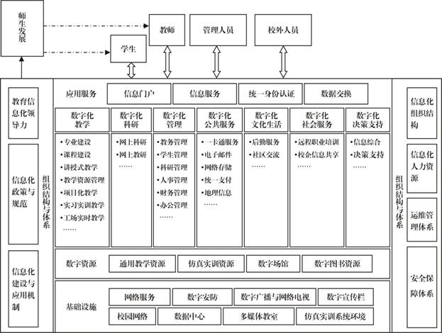 职业院校数字校园不仅仅是信息化技术系统的建设,更重要的是突出机制创新,重视职业院校信息化组织结构与体系的构建。组织结构与体系是数字校园的有机组成部分,是数字校园顺利实施、平稳运行和持续发展的保障,包括信息化领导力、信息化组织机构、信息化政策与规范、信息化人力资源、信息化建设与应用机制、运维管理体系和安全保障体系七个方面。