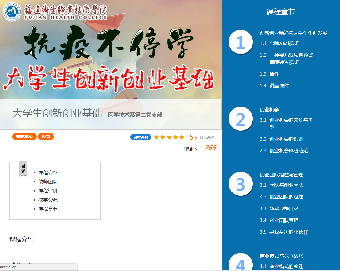 医学技术系第二党支部在超星学习通平台开设《大学生创新创业基础》在线课程,共上线16学时课程,内容涵盖创新创业精神、创业机会、创业团队组建于管理、商业模式与竞争战略、新产品营销、互联网+创业、初创项目的财务资源规划、创业计划书的书写技巧,有助于引导学生增加创新创业基础知识储备。共有33位同学作为参赛梯队队员,参与了首批次的网络学习。