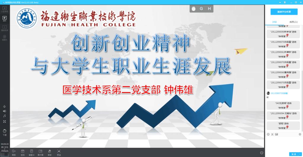 3月26日晚,借助腾讯课堂直播平台,钟伟雄老师给19级创新创业小组的同学们带来一场题为《创新创业精神与大学生职业生涯发展》的直播培训讲座。同学的创新创业热情被点燃。