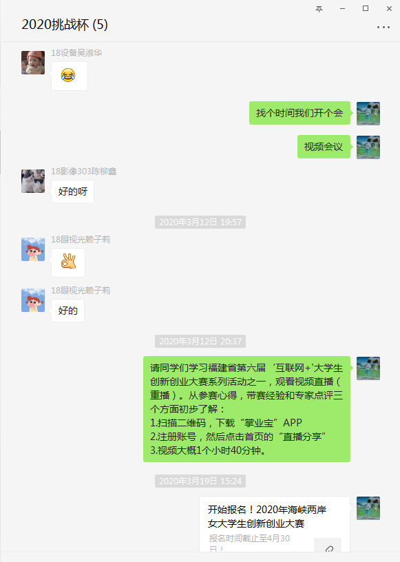 3月27日晚,在前期电话、QQ、微信沟通指导的基础上,终于有一个项目趋于成熟,并成功召开第一次项目小组会议。项目小组的负责人是第二党支部入党积极分子18设备302林诗颖同学,参与的同学有19影像302温梓杰、19影像302陈鸿怡、19设备301朱舒婷、19设备302沈爱玲、19影像304李唯一。