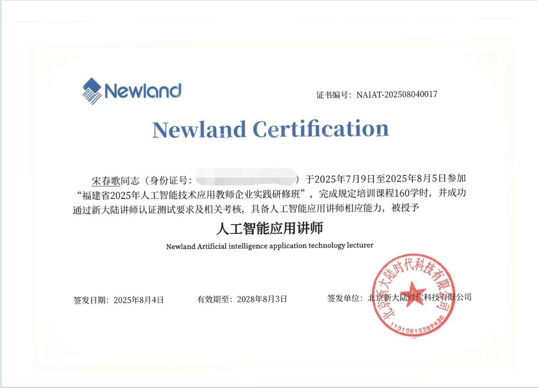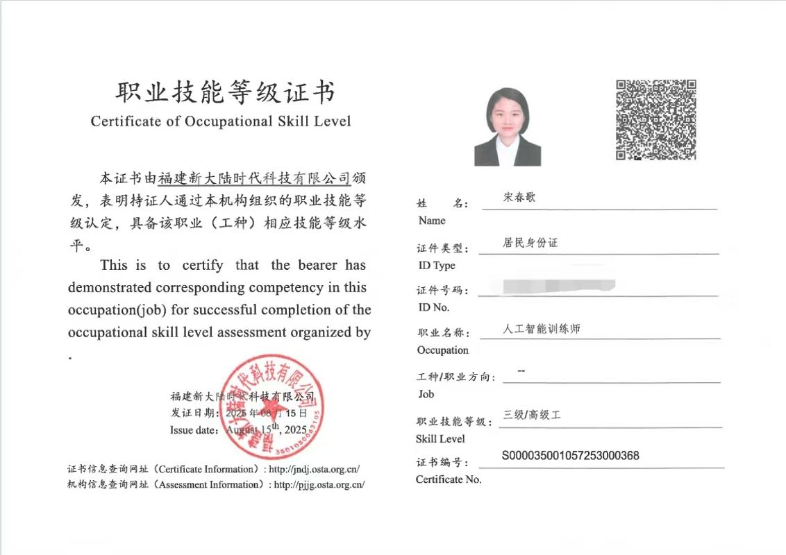 值得一提的是,在严格考核后,宋春歌老师获得了由新大陆科技有限公司颁发的“人工智能训练师(三级)”证书及“人工智能应用讲师”证书。双重认证不仅是对教师技术能力与教学能力的权威认可,也为职业院校申报“双师型”教师、优化专业师资结构提供了有力支撑。