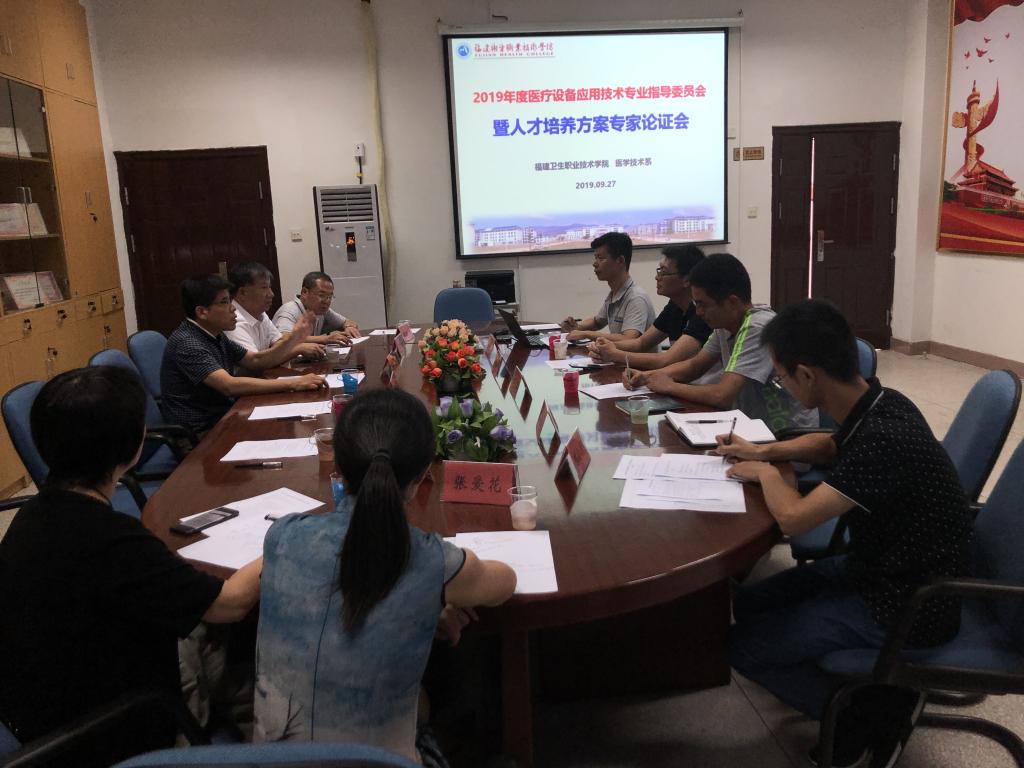 2019年09月27日下午,医疗设备应用技术专业人才培养方案论证会在医学技术系三楼会议室召开,会议由教研室主任陈文山老师主持,福建省立医院设备处计量主任徐子琴、福建医科大学附属第一医院设备科主任陈文培、福建医科大学附属协和医院设备科高级工程师林为国、福建中医药大学附属人民医院设备科主任黄亮卿、福建中医药大学附属第三人民医院设备科主任张爱花等医疗设备专业指导委员会成员与医疗设备应用技术专业教师及18级医疗设备专业的两位学生代表参加了此次会议。