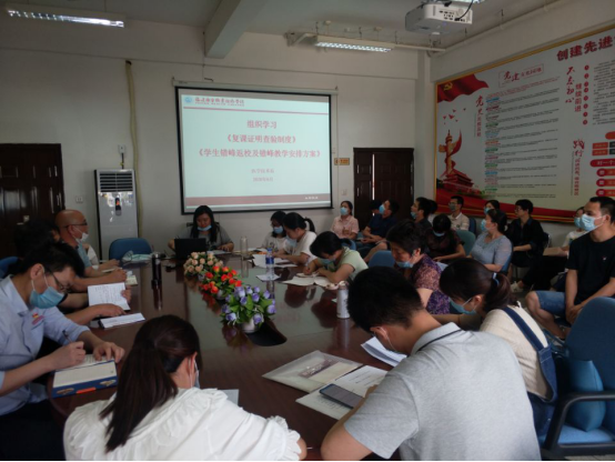 时值6月,新冠肺炎的疫情防控还是不容忽视,而在校生的返学问题也迫在眉睫。为了加强教师对学生错峰返校教学安排的了解和保障广大师生的身体健康,2020年6月4日,医学技术系组织全体教师共同认真学习了“两案八制”中的《复课证明查验制度》和《学生错峰返校及错峰教学安排方案》两个文件。