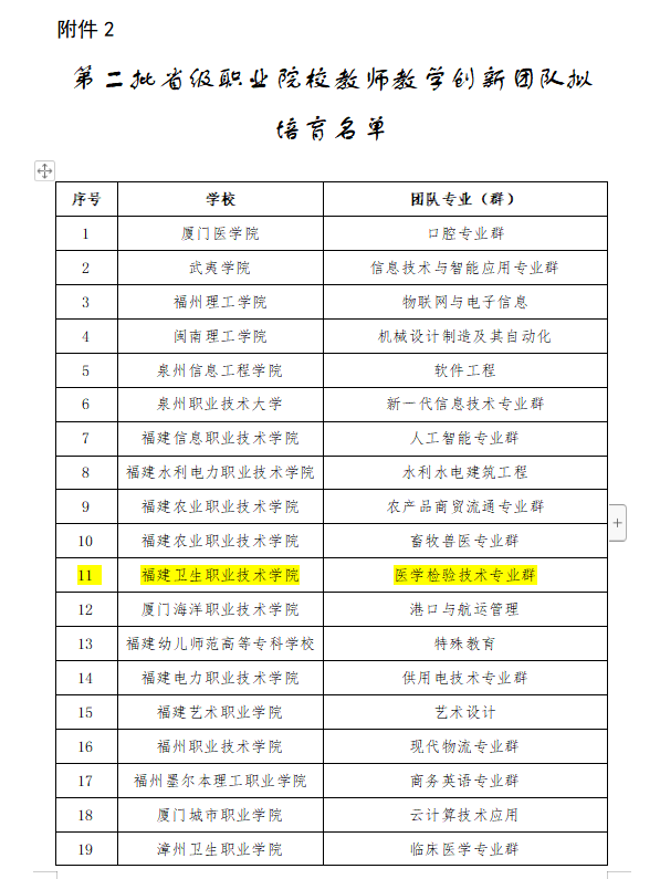 经福建省教育厅评审,“医学检验技术专业群教师创新团队”入选第二批省级职业院校教师教学创新团队培育名单。