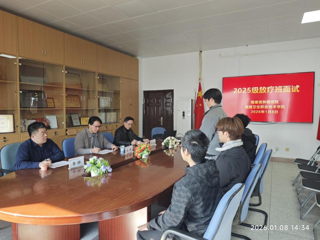 1月8日上午,医学技术与工程学院举办2025级放射治疗方向班面试选拔会。学院特邀福建省肿瘤医院的张伟、傅万凯、陈超等3位医院带教老师担任此次面试的专家评委,来自25级医学影像技术专业的36名学生参加本次面试。