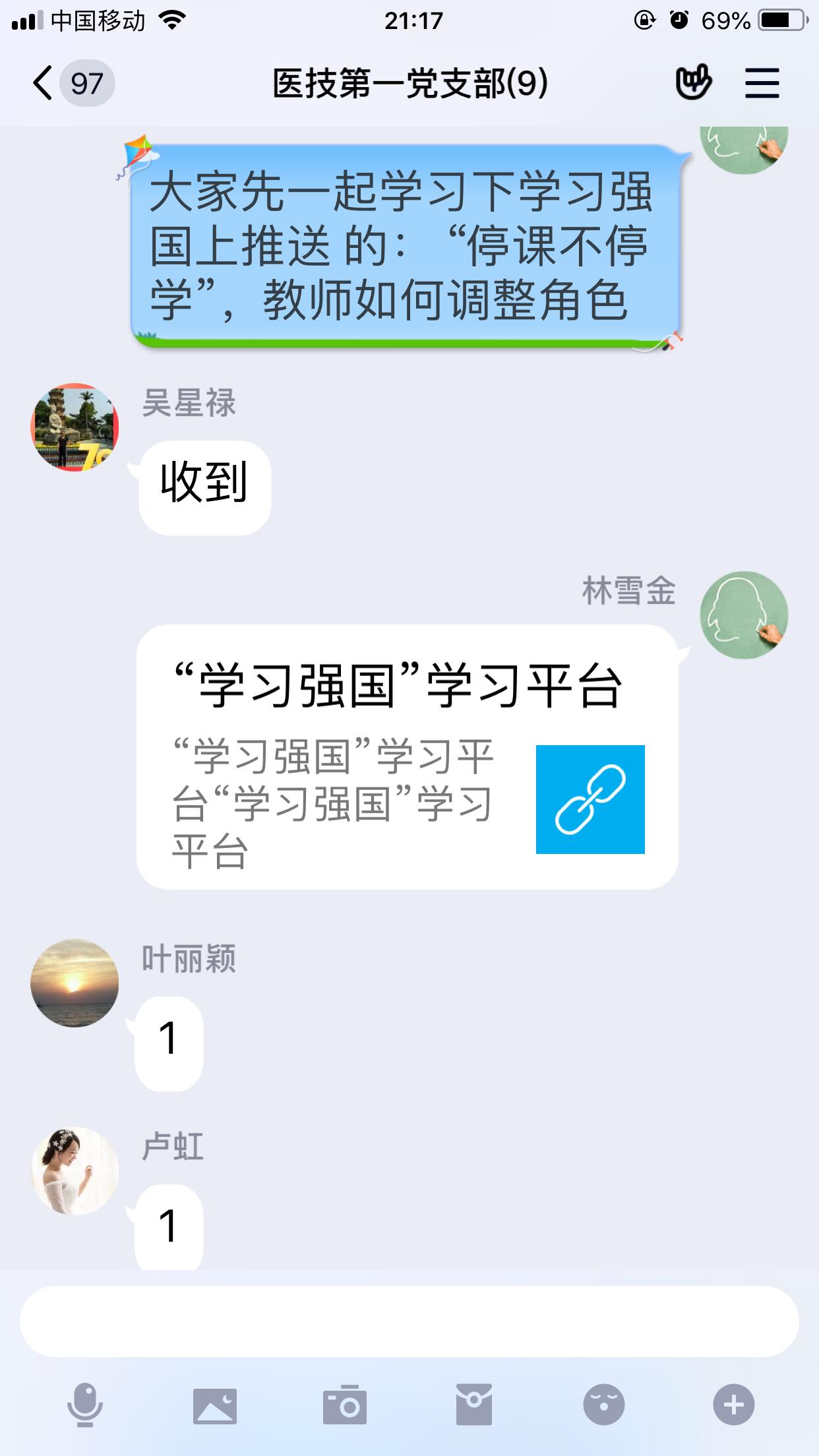 2月20日晚,在线学习的第四天,医学技术系第一、第二和学生党支部开展了一次特别的支部大会,围绕“停课不停学”开展学习和讨论,总结提升教学经验。党员老师学习了习近平总书记在中央政治局常委会会议研究应对新型冠状病毒肺炎疫情工作时的讲话,学习了《教育部应对新型冠状病毒肺炎疫情工作领导小组办公室关于在疫情防控期间有针对性地做好教师工作若干事项的通知》,认真领会防疫工作重要精神和工作部署,进一步增强党员教师对打赢这场战“疫”的信心。同时,结合学习强国APP文章《“停课不停学”,教师如何调整角色》,教师党支部着重从如何组织好在线教学开展了深入交流;学生党支部则侧重探讨如何引导学生有效开展线上学习。大家都认为本次全课程的线上教学是一次培养学生自主学习能力的好机会,有效的指引、多样的互动、及时的评价,可以达到较好的停课不停学效果。