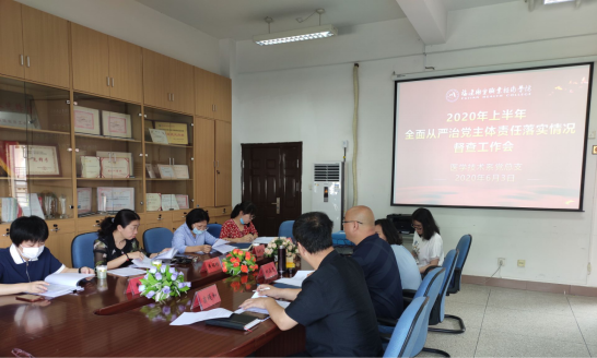 2020年6月3日上午,医学技术系党总支在系部会议室召开2020年上半年全面从严治党主体责任落实情况督查会议,黄铭珊副校长、党委工作部组织干部科科长黄小芳、纪检监察室监察科科长廖晓愿、管理系专职组织员张云霞一行到场巡查,医学技术系领导班子成员、总支支委、各支部代表参加本次会议。