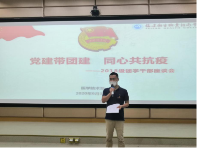 为进一步强化党建带团建,团建促党建工作,提升团学干部思想意识,增强党性修养,6月30日,在建党99周年之际,医学技术系于实训楼演播室召开“党建带团建,同心共抗疫”团学干部座谈会。会议由系团总支书记曾庆才老师主持,系党总支负责人邱滚忠副书记出席会议,系团总支副书记方新荣老师、各班辅导员、2018级团学各部门干部参加会议。