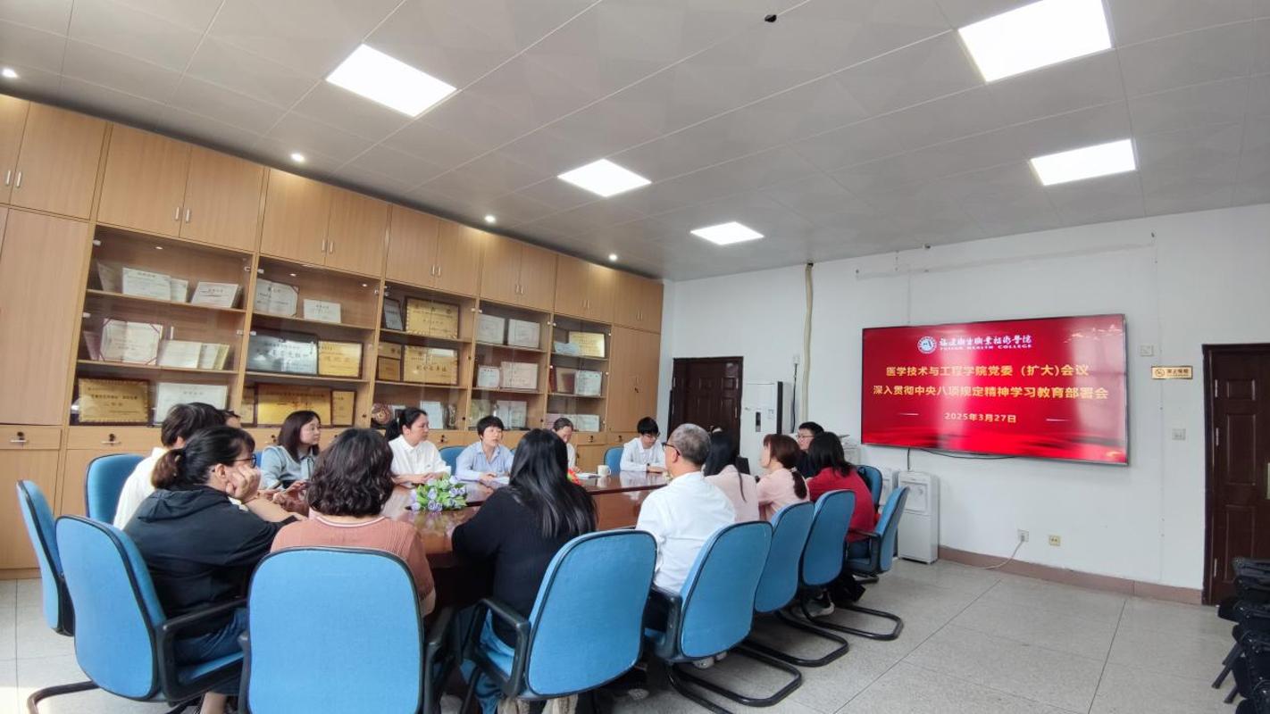 3月27日,医学技术与工程学院召开党委(扩大)会议,研究部署深入贯彻中央八项规定精神学习教育工作。学院党委委员、党支部委员参加会议,学院党委书记柯琼莺主持会议。