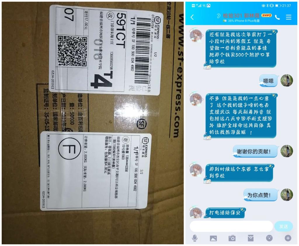 2020年3月24日,开云在线登录app入口收到了一个快递,里面有500个医用口罩,而寄出这个包裹的正是19检验301班的郭林薇同学。郭同学把她生平第一次打工赚的钱全买了口罩寄给母校,希望能为学校防控新冠肺炎疫情尽点绵薄之力。