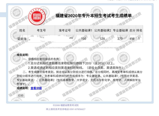 近日,2020年福建省普通高等教育专升本考试成绩及录取分数线公布,医学技术系17级医学检验技术专业学生梁丽萍,在今年医学检验类招生计划数少,考生多,竞争激烈的情况下,以总成绩498分(满分600分)的优异成绩成为福建省医学检验类状元!捷报传来,全系师生欢欣鼓舞!