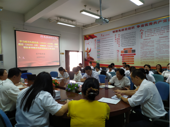 时值金秋九月,新冠肺炎疫情防控处于常态化阶段,2019级和2017级五年专学生返校复学在即。为切实做好疫情防控工作,2020年9月3日,医学技术系组织全体教师共同认真学习了闽卫办疾控函〔2020〕668号、闽委教综〔2020〕8号、闽教体〔2020〕16号等秋季学期开学疫情防控工作文件精神。