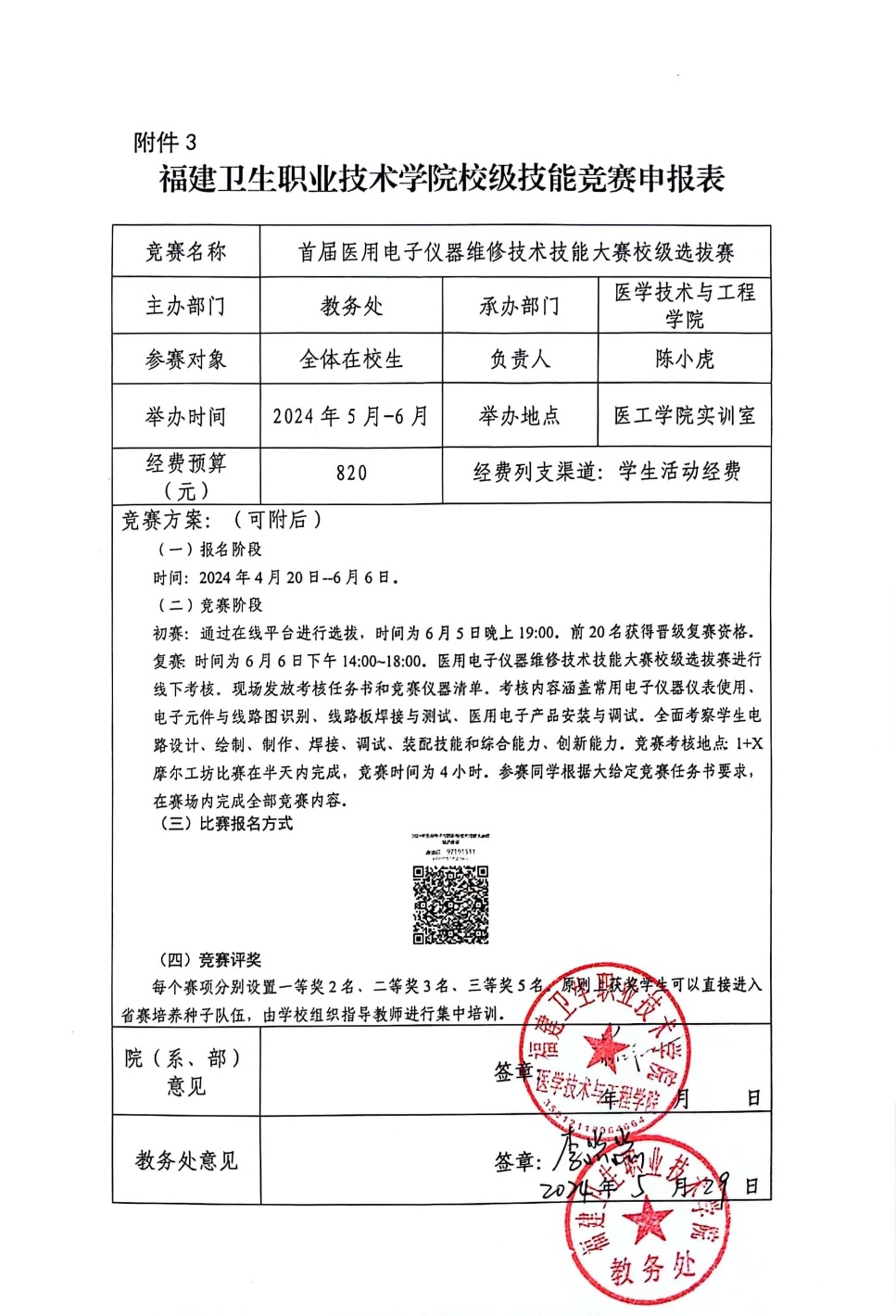 初赛:通过在线平台进行选拔,时间为6月5日19:00。前20名获得晋级复赛资格。复赛:时间为6月7日下午2点-6点。医用电子仪器维修技术技能大赛校级选拔赛进行线下考核。现场发放考核任务书和竞赛仪器清单。考核内容涵盖常用电子仪器仪表使用、电子元件与线路图识别、线路板焊接与测试、医用电子产品安装与调试。全面考察学生电路设计、绘制、制作、焊接、调试、装配技能和综合能力、创新能力。竞赛考核地点:1+X摩尔工坊比赛在半天内完成,竞赛时间为4小时。参赛同学根据给定竞赛任务书要求,在赛场内完成全部竞赛内容。