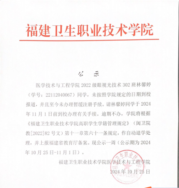 关于22眼视光302林馨婷自动退学的公示