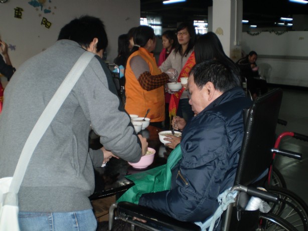 活动当天,大家首先给老人们送上满载祝福的拗九粥。刘利根等同学一边陪老人聊天拉家常,听老人讲他们当年艰苦的生活,一边向院领导询问了老人在老年院的生活状况。同学们有的给老人们喂水果,有的搀扶着双腿不便的老人,帮助他们进行康复锻炼。中午同学们准备了丰盛的午餐,并亲手喂到行动不便的老人口中。一天的活动,老人们欢声不断,笑语连绵,充满着祥合的气氛。