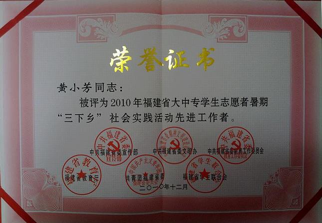 经中共福建省委宣传部、中共福建省文明办、中共福建省委教育工作委员会、福建省教育厅、共青团福建省委、福建省学生联合会联合评定,我院医学技术系黄小芳老师被评为:2010年福建省大中专学生志愿者暑期“三下乡”社会实践活动先进工作者。