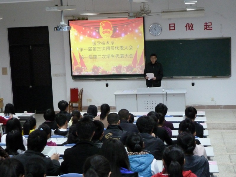 2011年4月6日晚,医学技术系第一届第三次团员代表大会暨第一届第二次学生代表大会在教学楼210召开。医学技术系党总支副书记洪聿荣老师、团总支副书记郭淼丽老师、全体辅导员、各班学生代表及各兄弟系部团、学干部参加了此次大会。会议由系团总支副书记兰浩敏主持。