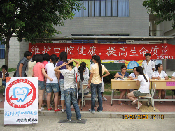 为迎接“9-20 国际爱牙日”,检验影像系于2009年9月17日在学院食堂前的宣传栏处举办“维护口腔健康,提高生命质量”义务宣传活动。口腔专业教师马清璇、邵旭媛、魏小平、杨坦以及06口腔501班、07口腔501班学生参加本次活动。 师生们热情地为广大同学们提供口腔检查,宣传正确的刷牙方式、牙线的使用以及如何维护口腔健康等知识。 此次活动体现出我系的教学成果以及专业特色,使同学们对本专业的知识有了更进一步的了解和认识,取得了满意的效果。