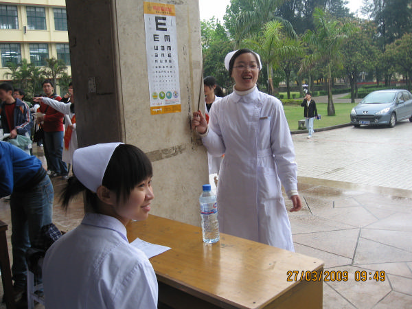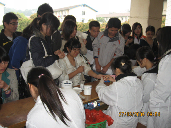 为体现医务工作者救死扶伤的人文精神,检验影像系联合护理系于2009年3月28日走进福州大学至诚学院开展主题为“学雷锋,促交流,携手文明卫生,共创和谐至诚”的义工活动。 本次活动由检验影像系团总支、护理系团总支和福州大学至诚学院学生会主办,在策划和筹备中,得到各方领导、老师的大力支持。我院由口腔教师马清璇、邵旭媛带队,共有53名学生参加。同学们在现场设立了ABO血型鉴定,测量身高、体重、肺活量、血压、视力,辨色检查和龋齿检查等体检项目。除了进行结合专业的检查外,师生们还认真介绍口腔预防保健、血液、献血等常识,并由护理专业学生进行现场急救、止血包扎的互动示范。 此次活动体现出我院的教学成果以及专业特色,使同学们对本专业的知识有了更进一步的了解和认识,取得了满意的效果。而且通过本次活动增强了两院之间的交流,构建和谐的校园文化。