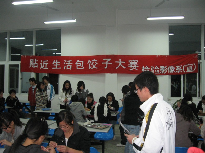 为给同学们提供一个互相交流、娱乐的平台,进一步增进同学们的感情,增强班级凝聚力,检验影像系于11月19日晚上7:30在明湖餐厅举办了“贴近生活”的包饺子比赛。各班选派5位同学参加,辅导员和学生会干部担任这次比赛评委。
