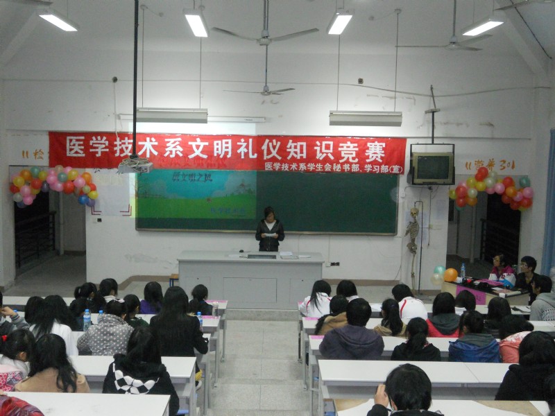 为宣传普及文明礼仪知识,弘扬中华传统礼仪,并加强大学生的道德修养,医学技术系学生会秘书部、学习部于2011年12月13日晚在系部二阶教室举办“文明礼仪知识竞赛”。