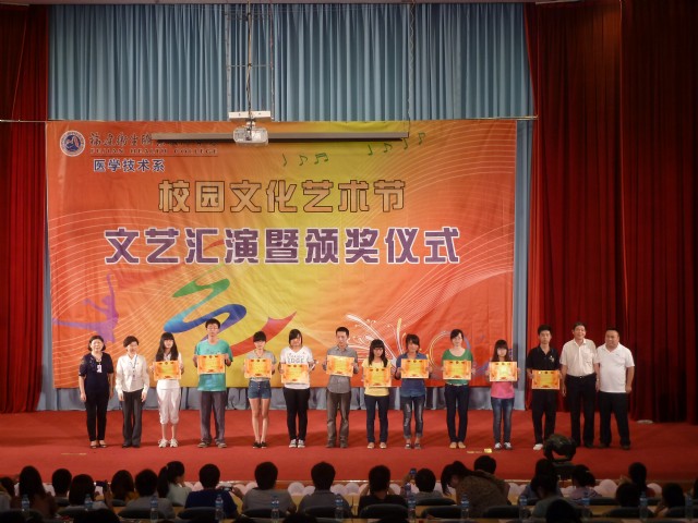 医学技术系文化艺术节暨颁奖典礼于2012年5月8日晚在学术厅隆重举行。学院领导严肃书记、魏立娜副院长、检验专业特聘教授叶晨主任、福州金域医学检验中心江真君经理、学工处黄铭珊处长、教务处庄海林副处长、医学技术系马少宁主任、洪聿荣副书记、郭礼坚副主任、魏碧娜副主任、院团委宋维副书记、王烨老师,以及各班辅导员、兄弟系部团总书记等应邀参加了此次文艺演出。