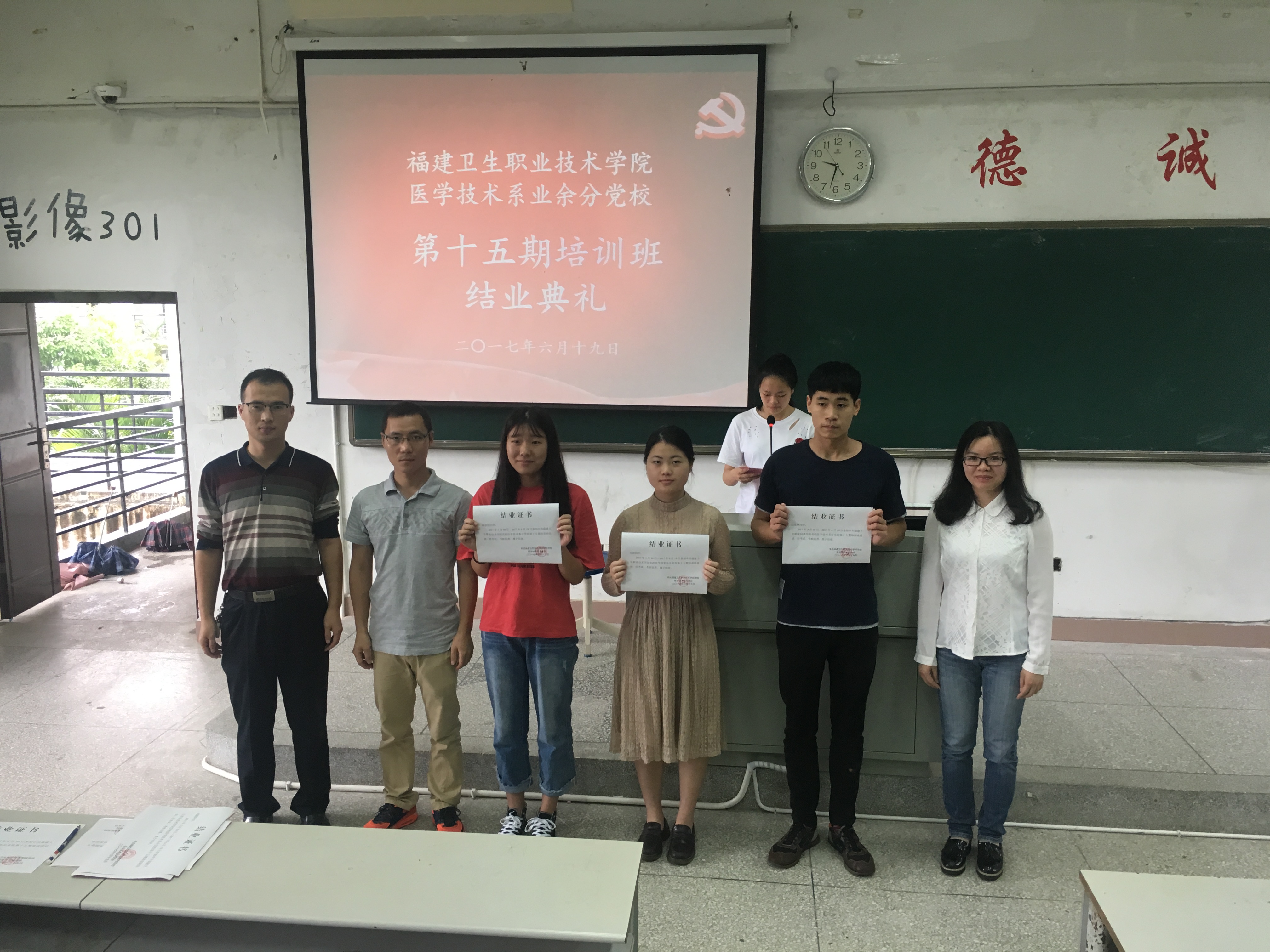 2017年6月19日上午,医学技术系在系部第二阶梯教室举行第十五期业余党校结业典礼。出席的人员有系党总支副书记邱滚忠书记,学生党支部书记黄玲云老师、辅导员梁永超、曾庆才老师以及全体学员们。本次结业典礼由15检验302班杨丽鹃同学主持。