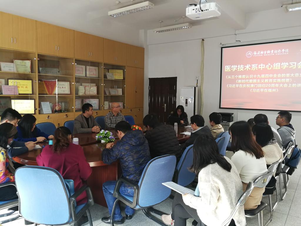2019年12月25日, 医学技术系在系部楼301召开中心组学习(扩大)会议,学习《从三个维度认识十九届四中全会的重大意义》、《新时代爱国主义教育实施纲要》、《习近平在福州》、《习近平在庆祝澳门回归20周年大会上的讲话》精神,会议由系党总支负责人邱滚忠同志主持。