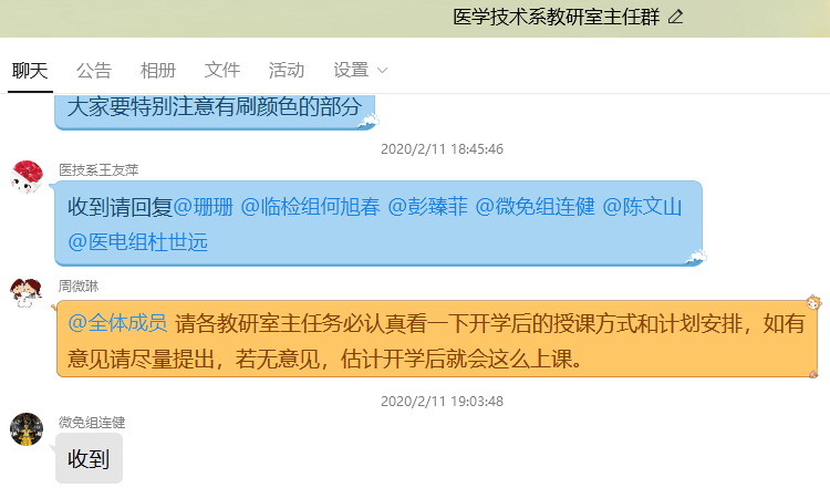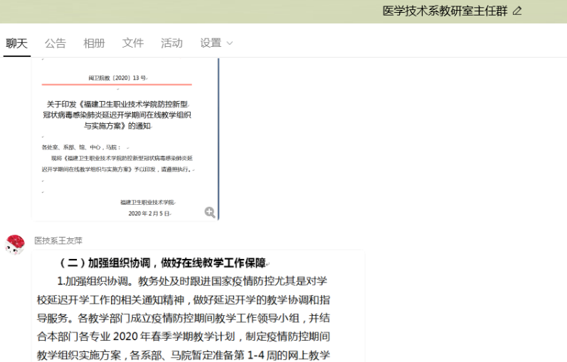 按照“推迟开学不停学”的原则,各教研室主任积极开展本学期教学工作安排,通过各教研室网络群组织做好开展在线教学和在线辅导的准备工作