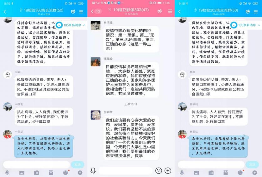 在新冠肺炎疫情防控的战线上,辅导员们通过班群每日组织学生“云”打卡、排摸学生健康情况,尽职尽责地宣传防控知识,组织学习开展心理健康学习,用贴近学生的话语去传播防疫的信念、温暖、爱与力量。
