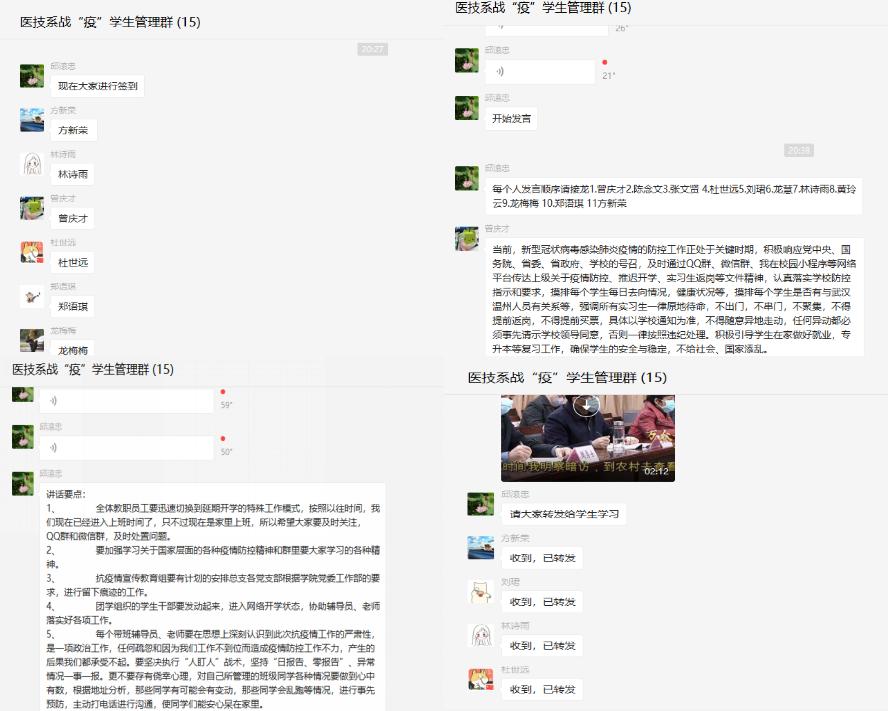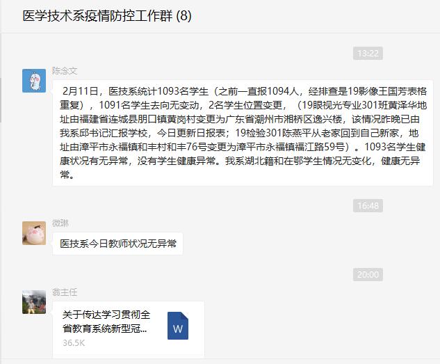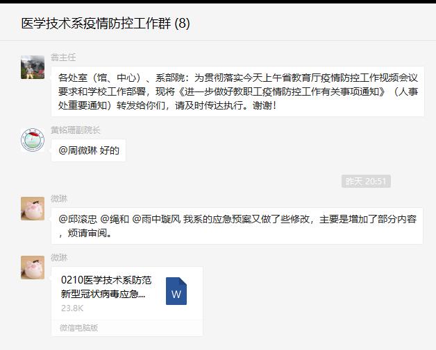 医学技术系防控工作领导小组及时传达和学习有关通知精神,研究制定《医学技术系防范新型冠状病毒应急预案》,每日通报系部师生健康情况。