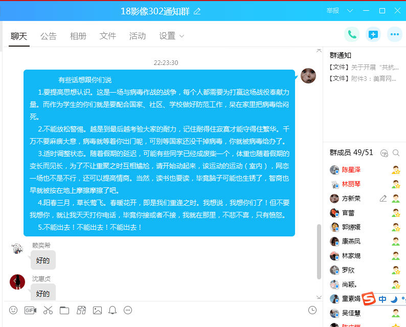 各班级同学开展了主题网络班会,一起学习了解战“疫”大形势,进行科普知识,讨论如何树立健康心态,合理安排假期学习和生活,号召大家做助力员、宣传员、示范员,助力战“疫”。有的班级还制作了祝福视频,为打赢疫情防控阻击战加油鼓劲。